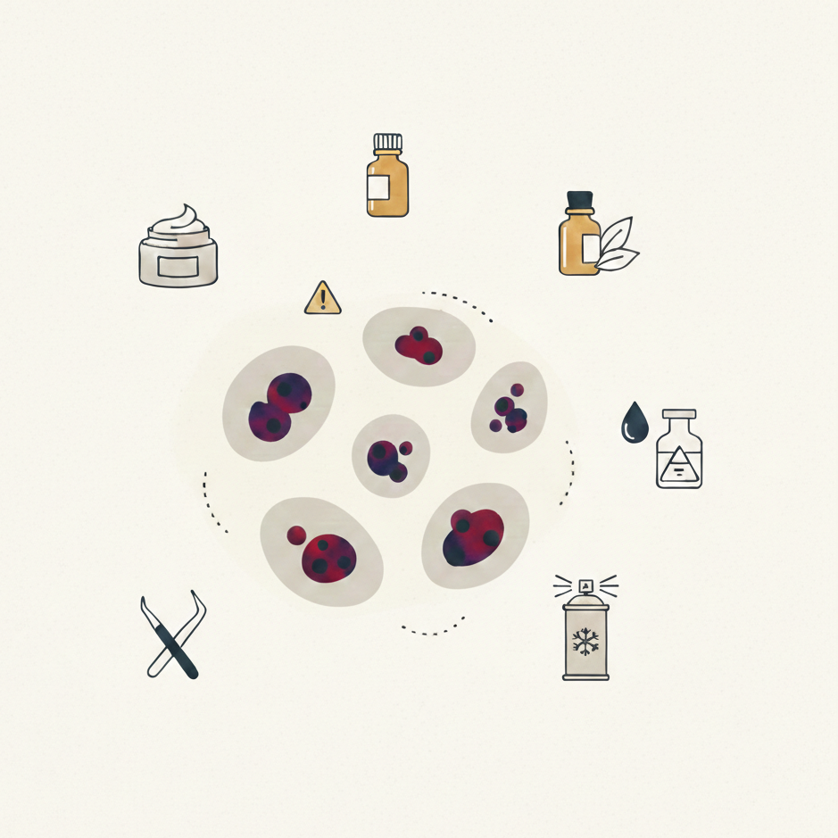 Many people search for a home treatment to avoid attending a clinic. Online suggestions may include creams, oils, acids, freezing sprays, or attempts at physical removal.